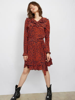 Robe courte rouge et noire cintrée et volantée à motif pois d'Anine Bing
