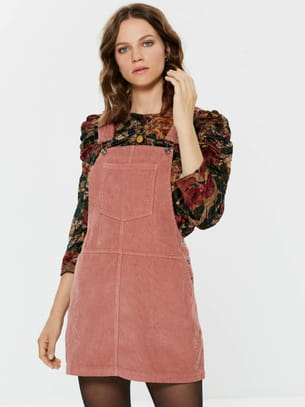 Robe-salopette courte en velours côtelé couleur vieux rose avec poche plaquée sur la poitrine et finitions argentées de Balzac Paris