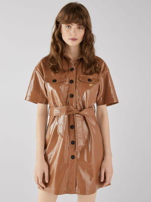 Robe-chemise courte et ceinturée couleur camel en simili cuir verni et boutons noirs avec poches à rabat sur la poitrine de Bershka