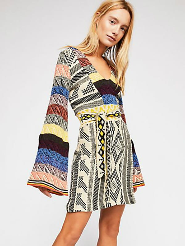 Robe courte et ceinturée en jersey multicolores à col en V et manches évasées de Free People