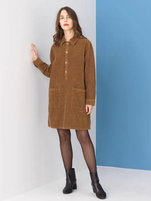 Robe courte et droite en velours côtelé couleur moka avec poches plaquées sur le devant de Le Mont St Michel