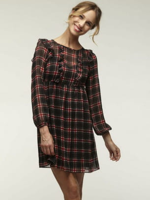 Robe courte et ample à carreaux rouges et noires et volants sur la poitrine de Naf Naf