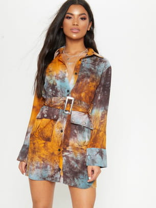 Robe-chemise courte et ceinturée à imprimés délavés multicolores avec poches à rabat sur le devant de PrettyLittleThing