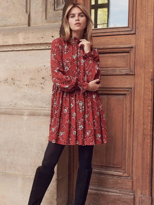 Robe courte et ample couleur tomette à imprimé folk avec col et manches smockés de Sézane