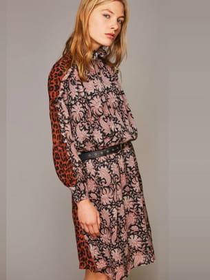 Robe courte à imprimé floral sur le devant et imprimé léopard dans le dos avec taille élastique et col volanté d'Antik Batik