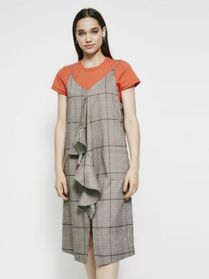 Robe mi-longue couleur taupe à motif prince de galles avec volants et fente sur le devant d'Elevenparis