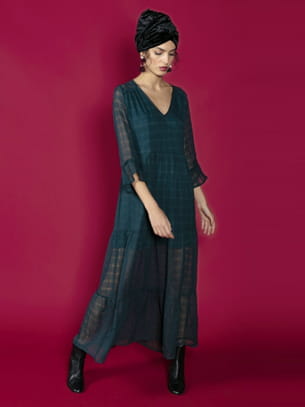 Longue robe transparente à encolure en V et motifs à carreaux avec manches volantées couleur vert sapin de Grace & Mila
