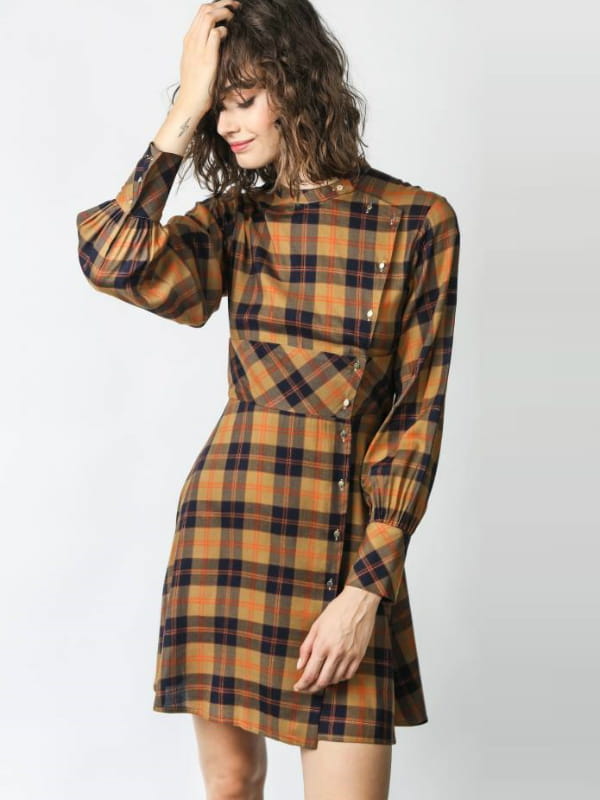 Robe courte marquée à la taille à imprimé écossais couleur ocre avec fil et boutons argentés de les Petites...