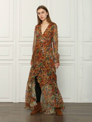 Longue robe fluide forme cache-cœur couleur ocre avec imprimés plumes multicolores et fil doré de See U Soon