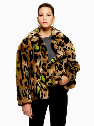 Manteau court en fausse fourrure imprimée léopard avec des touches de vert fluo de Topshop