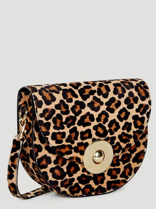 Petit sac à main demi-lune en cuir de vachette façon poulain imprimé léopard avec fermoir doré et bandoulière porté épaule de Tara Jarmon