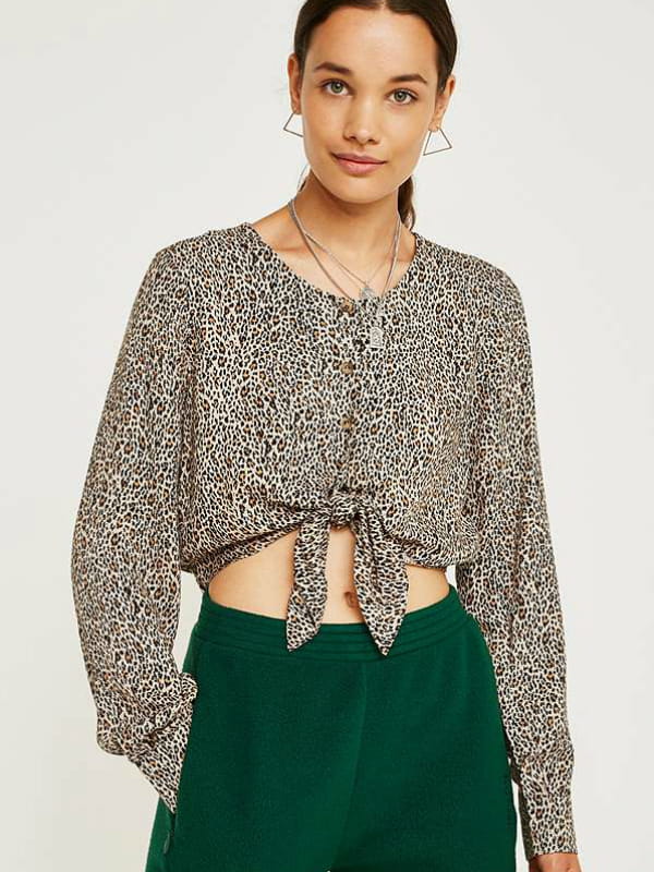 Crop top noué à boutons et manches longues coupe loose imprimé léopard d'Urban Outfitters