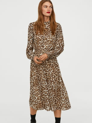 Robe midi fluide à col raglan froncé et manches longues imprimée léopard d'H&M