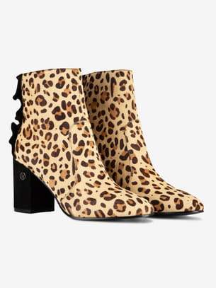 Boots en cuir effet poulain imprimé léopard à talon large en daim noir avec détail volant à l'arrière de la chaussure en daim noir de Liu Jo
