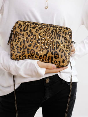 Sac à main en cuir façon poulain imprimé léopard avec bandoulière chaîne porté épaule de Swildens
