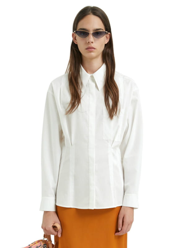 Chemise blanche à large col en pointe et larges épaules cintrée à l'aide de pinces et patte à boutonnage cachée avec poche plaquée sur la poitrine de Bimba Y Lola