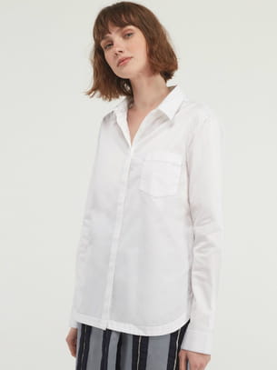 Chemise blanche en coton à col en pointe avec surpiqûres contrastantes noires et ourlets arrondis asymétriques avec poche plaquée sur la poitrine de Chloé Stora