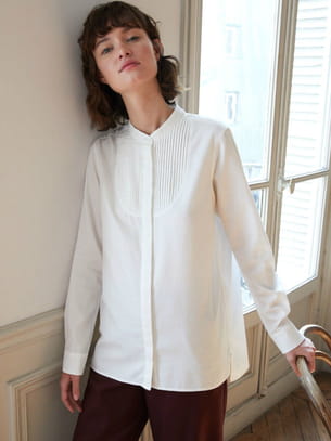 Longue chemise blanche en coton à col mao avec plastron strié et patte de boutonnage cachée et plis dans le dos de Comptoir des Cottoniers