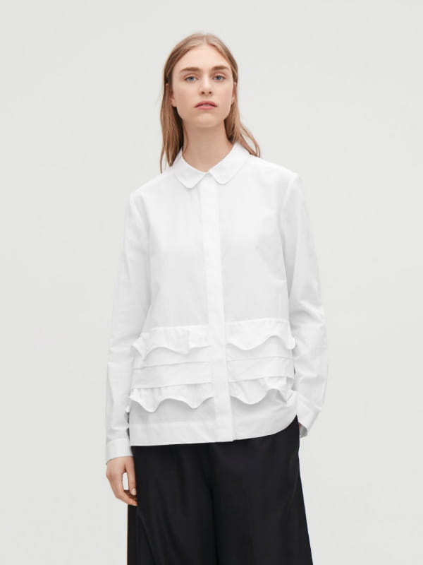 Longue chemise blanche oversize en coton à col claudine et patte de boutonnage cachée avec empiècements à volants de COS