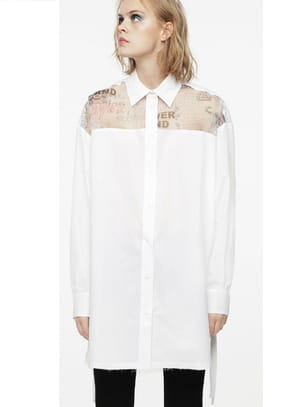 Longue chemise blanche asymétrique en coton à col en pointe et empiècements transparents imprimés avec nœuds latéraux de Diesel
