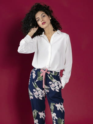Chemise blanche en polyester à col en pointe et poignets boutonnés avec dos ouvert en V brodé de fleurs de Grace & Mila