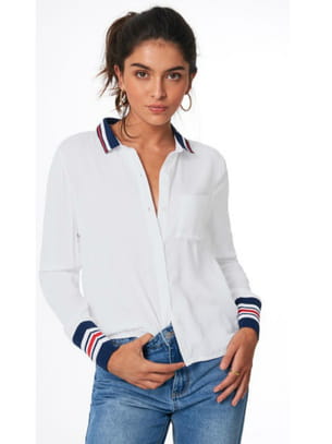 Chemise blanche courte et ample en viscose à col en pointe avec poche plaquée sur la poitrine et finitions bords côtes rayés bleus et rouges de Jennyfer