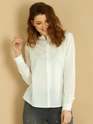 Chemise blanche en plumetis à col mao avec patte de boutonnage cachée et volantée de Kiabi