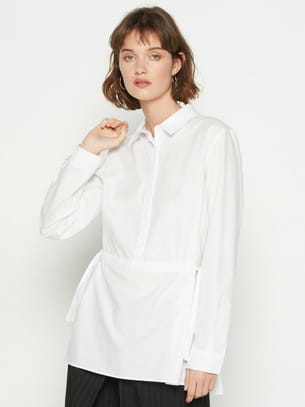Longue chemise blanche en coton à col en pointe cintrée par des liens à la taille avec fermeture boutonnée de Monoprix