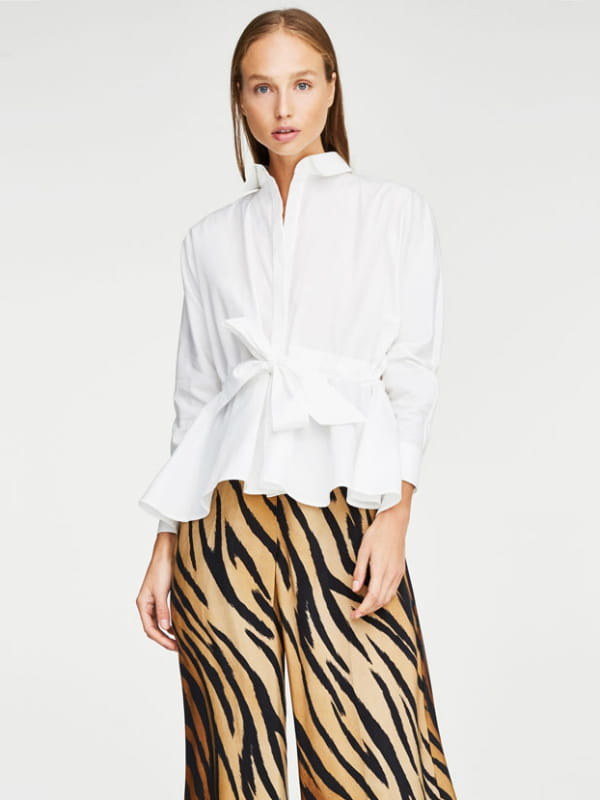 Longue chemise blanche en coton cintrée par un nœud avec volants en cascade et patte de boutonnage cachée à petit col en pointe d'Uterqüe