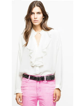 Chemise blanche en crêpe de soie fluide à plastron et col volantés avec fermeture boutonnée de Zadig & Voltaire