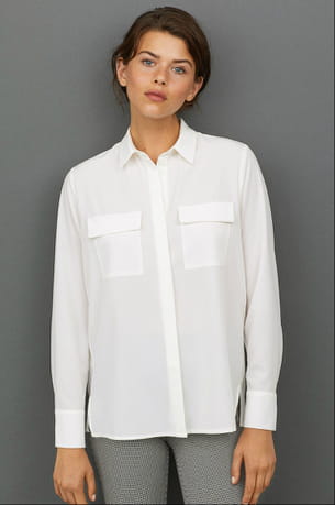 Chemise blanche en crêpe avec col en pointe et patte de boutonnage cachée avec fausses poches à rabat sur la poitrine et fentes latérales d'H&M