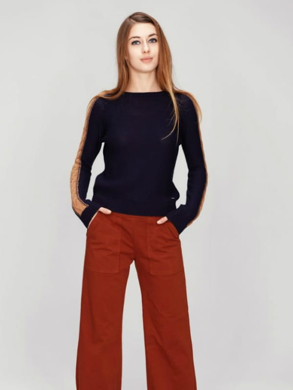 Pull bleu marine coupé droit à col ras du cou avec manches torsadées camel et bords-côtes côtelés d'Amor-Lux