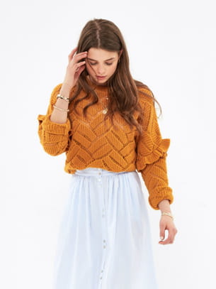 Pull couleur moutarde coupé ample à col rond en maille ajourée et détails à volants sur les manches de Balzac Paris