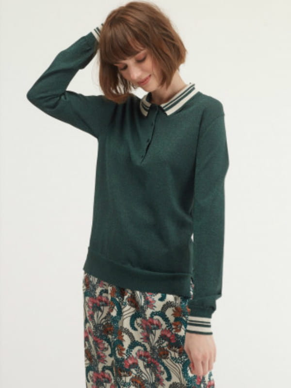 Pull couleur vert sapin esprit polo avec col en pointe et fermeture boutonnée aux bords-côtes rayés de Chloé Stora