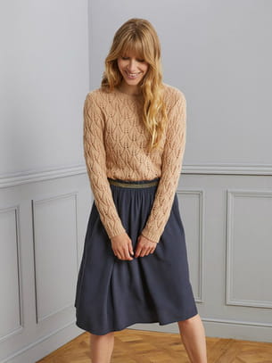 Pull couleur amande à maille ajourée motifs feuilles et encolure ronde de Cyrillus