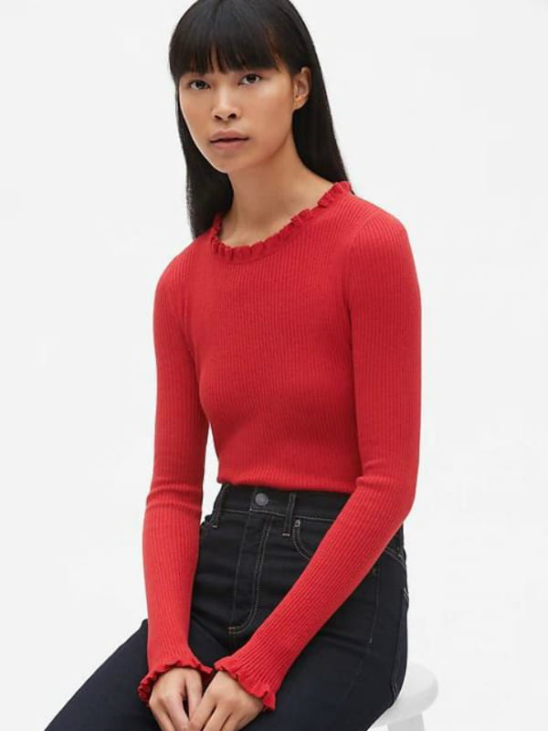 Pull rouge en maille fine côtelée à encolure et manches volantées de Gap