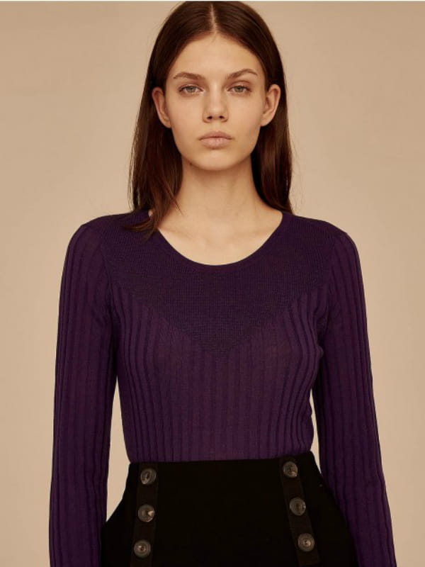 Pull couleur violine en maille fine côtelée à encolure ronde et détail strié en pointe à la poitrine de Gérard Darel