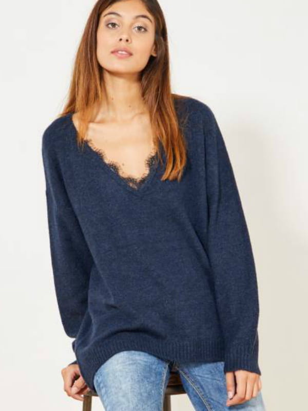 Pull couleur bleu marine oversize à encolure V soulignée de dentelle et manches chauves-souris de Kiabi