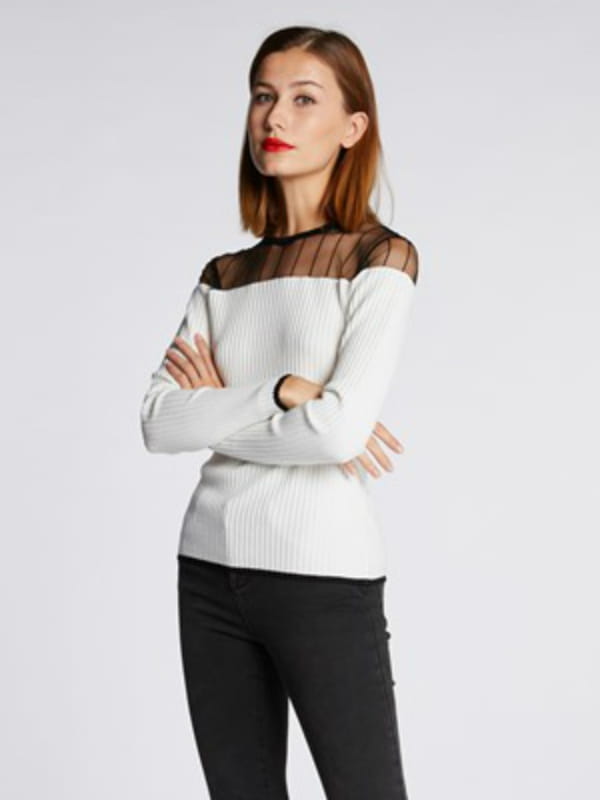Pull moulant blanc côtelé avec empiècement noir transparent rayé à encolure ronde et liseré contrastant noir aux manches de Morgan