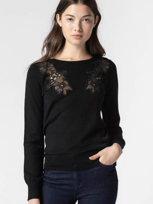 Pull moulant noir à encolure ronde avec fleurs brodées sur la poitrine de Pablo