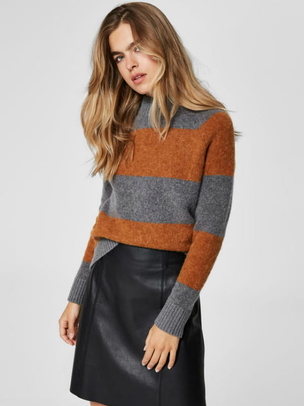 Pull ample à larges rayures horizontales grises et marrons avec col montant de Selected