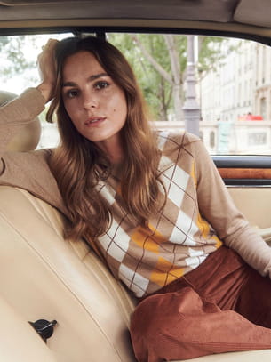 Pull couleur camel à encolure ronde et tricotage à carreaux argyle de Sézane