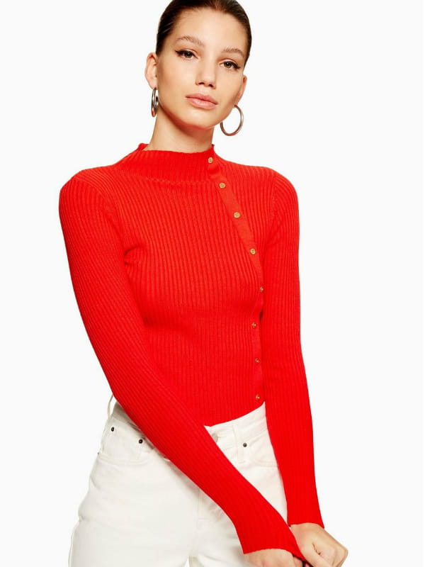 Pull près du corps rouge avec boutons dorés sur le côté et col montant de Topshop