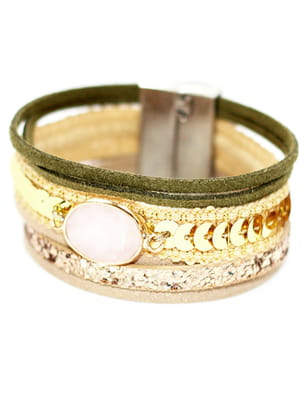 Bracelet manchette en suédine kaki paillette dorées et quartz rose de Bijoux Naives