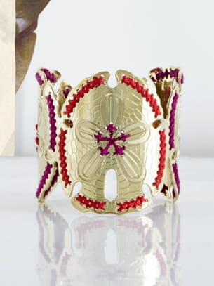 Bracelet manchette en laiton doré à l'or brodé de fil rouge et prune de Camille Enrico