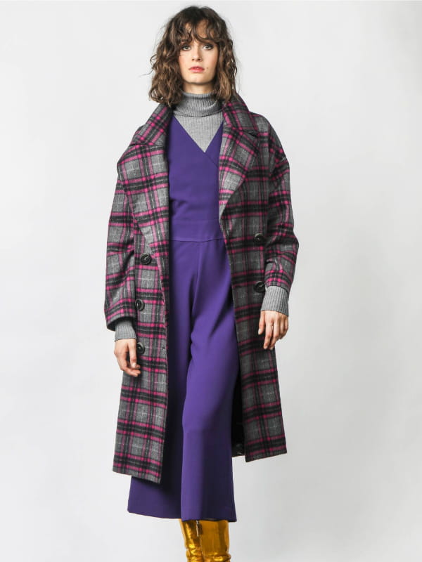 Long caban ample en laine mélangée grise et imprimés à carreaux rose à large col cranté versatile et double boutonnage croisé noir avec poches passepoilées sur les côtés de Les Petites...