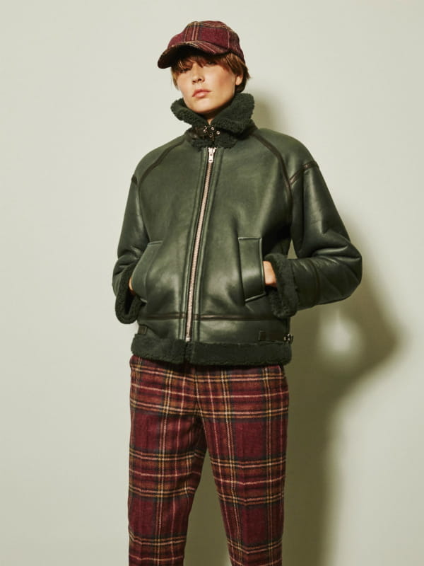 Bombardier en peau lainée couleur vert olive avec pattes de serrage au col et à la taille avec fermeture zippée dorée et poches passepoilées sur le devant de Maison Père