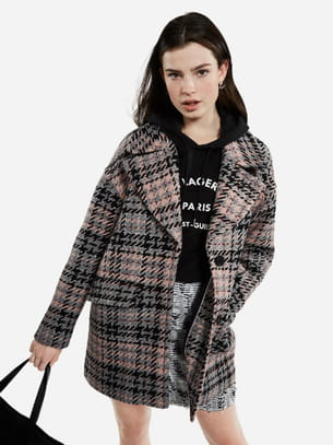 Caban court en laine mélangée grise avec imprimés à carreaux couleur rose dragée à col cranté et poches à rabat sur les côtés fermé par un simple boutonnage de Karl Lagerfeld