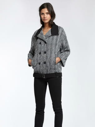 Caban court et ample revisité en maille tressée noire et blanche à forme boule et manches trois-quarts avec col contrastant et double boutonnage croisé noir de Morgan