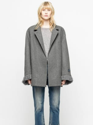 Manteau inspiration blazer oversize en laine mélangée grise à col tailleur et finitions frangées aux poignets avec emmanchures tombantes et fermeture crochets de Zadig & Voltaire